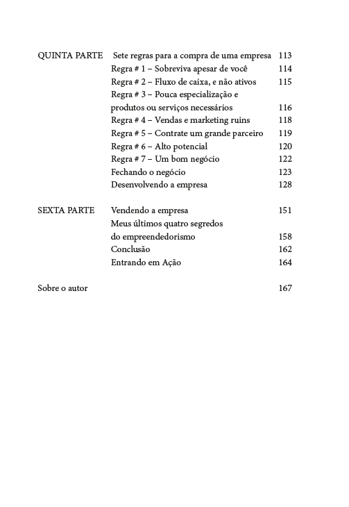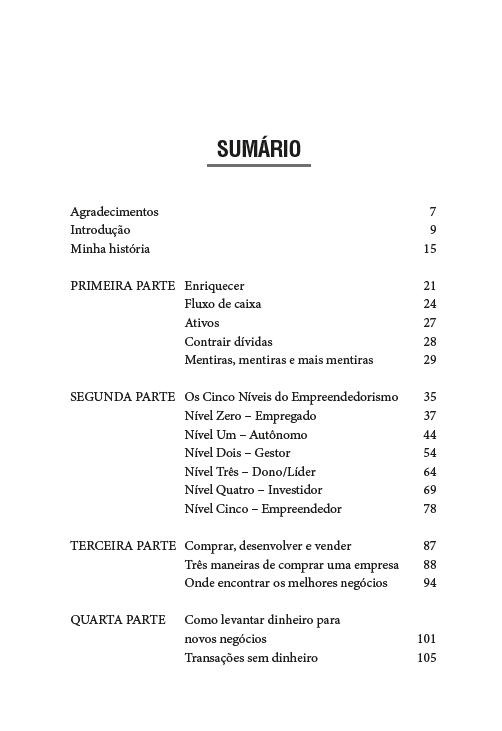 No livro, você aprende os 5 níveis do empreendedorismo e o que é necessário para evoluir em cada etapa. Também descobre como comprar e vender imóveis com inteligência, levantar capital, identificar oportunidades promissoras e seguir regras claras para adquirir empresas com segurança e visão de futuro.
