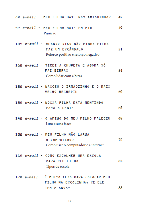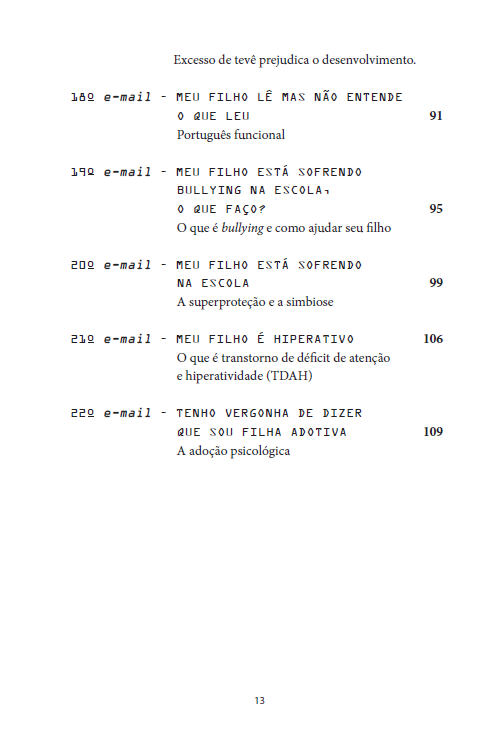 A boa notícia é que há solução para tudo isso! Com respostas baseadas na Psicologia e nos princípios da Educação, Marcos Meier oferece orientações de como lidar com cada uma dessas questões e trata também de assuntos atuais relacionados ao uso excessivo da internet, à chegada de um novo irmãozinho, à dificuldade de adaptação em uma nova escola, hiperatividade e bullying.