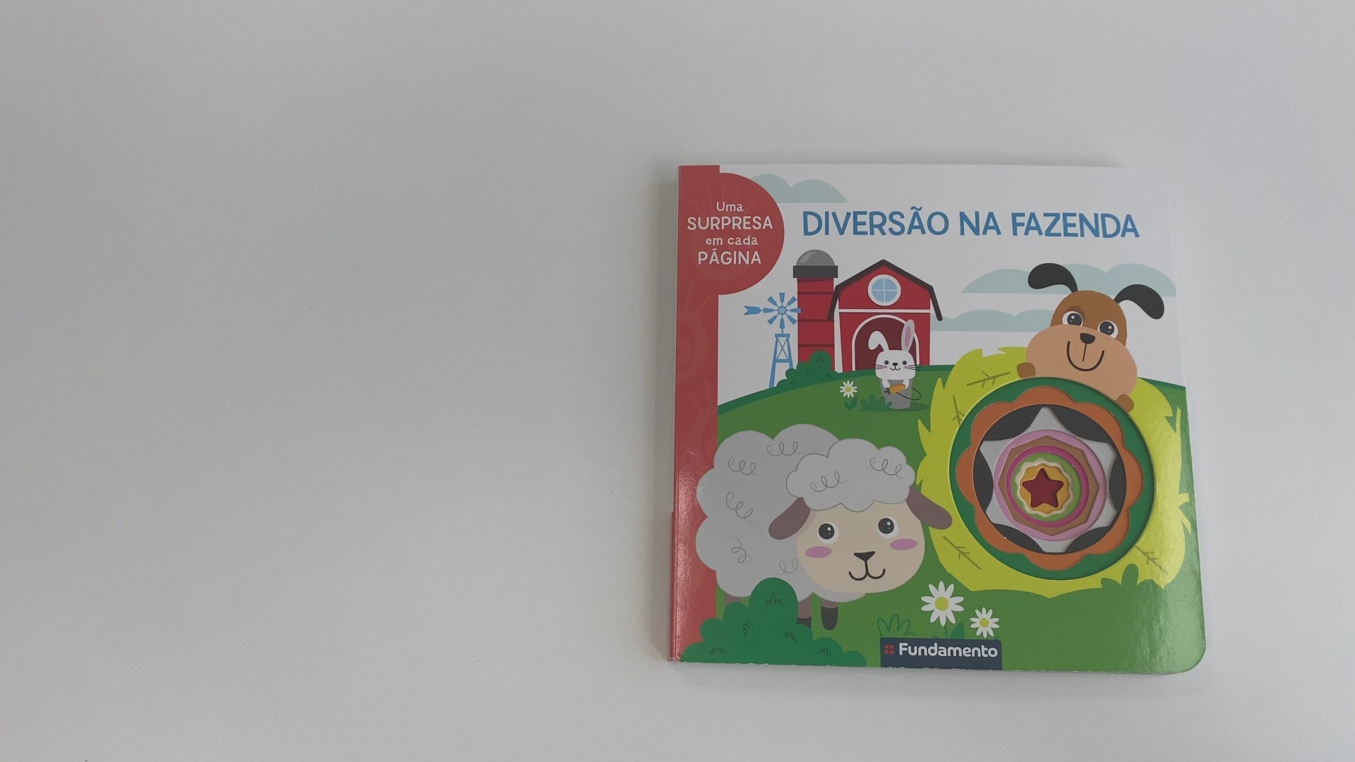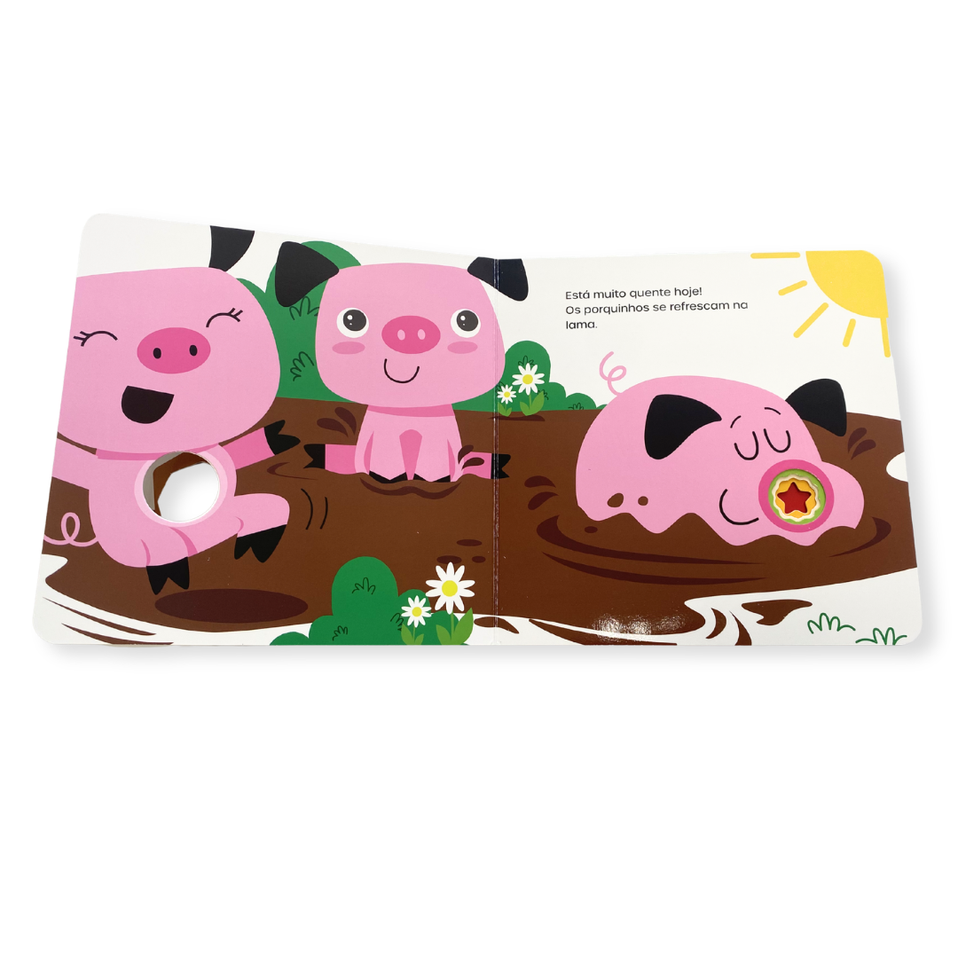 Livro infantil com elementos sensoriais para bebês de 1 a 3 anos, com temática de fazenda que estimula o aprendizado dos animais e do ambiente rural. Ideal para momentos de leitura interativa e descoberta.