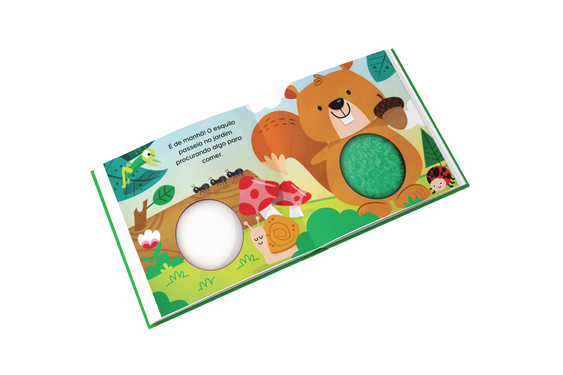 Livro infantil com elementos sensoriais para bebês de 1 a 3 anos, com cenário do campo que apresenta elementos da natureza e animais de forma simples e envolvente. Ajuda no desenvolvimento da atenção e no reconhecimento de imagens.