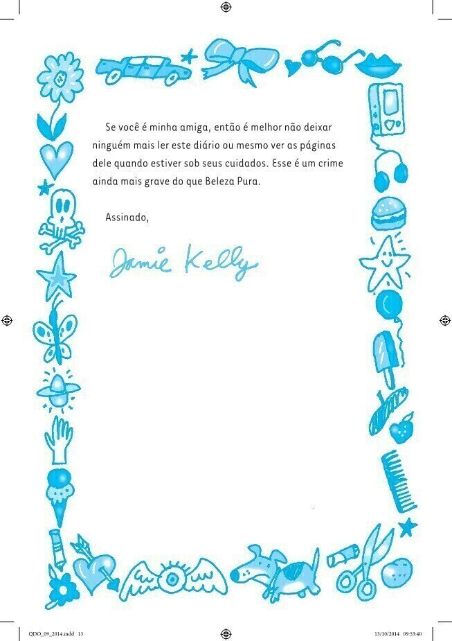 Eu, Jamie Kelly, declaro que este diário não deve ser lido por manés, pais xeretas, irmãos mais velhos (nem mais novos), loirazedas, professores ou cachorros fedidos (se existir algum que saiba ler). As consequências para quem desobedecer essa advertência serão muito, muito cruéis!