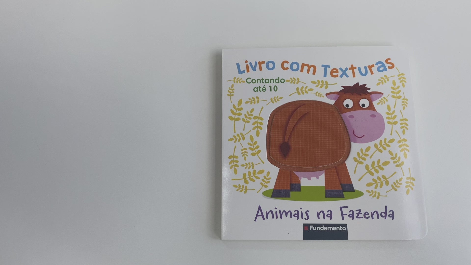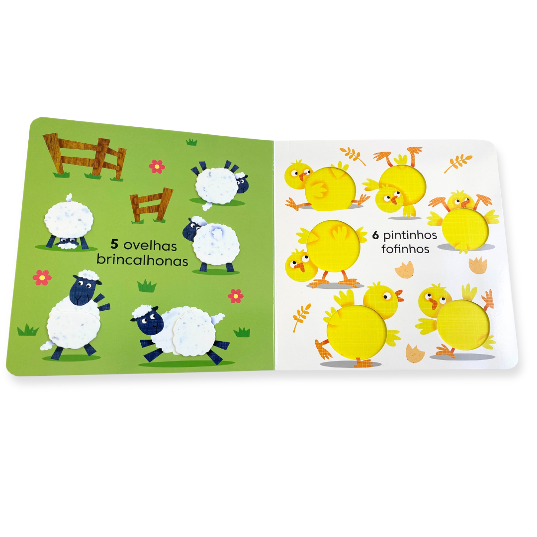 Livro infantil com elementos sensoriais para bebês de 1 a 3 anos, que introduz os números até 10 com temática de animais da fazenda. Ideal para estimular a contagem e o aprendizado inicial de forma lúdica.