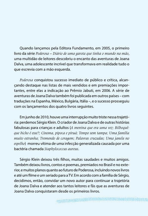 Com uma escrita sensível, elegante e cheia de humor, o autor brasileiro Sérgio Klein constrói uma narrativa que fala de coragem, identidade e superação. Poderosa é mais do que uma história fantástica — é um convite à reflexão sobre o poder das palavras e a força de acreditar em si mesmo.