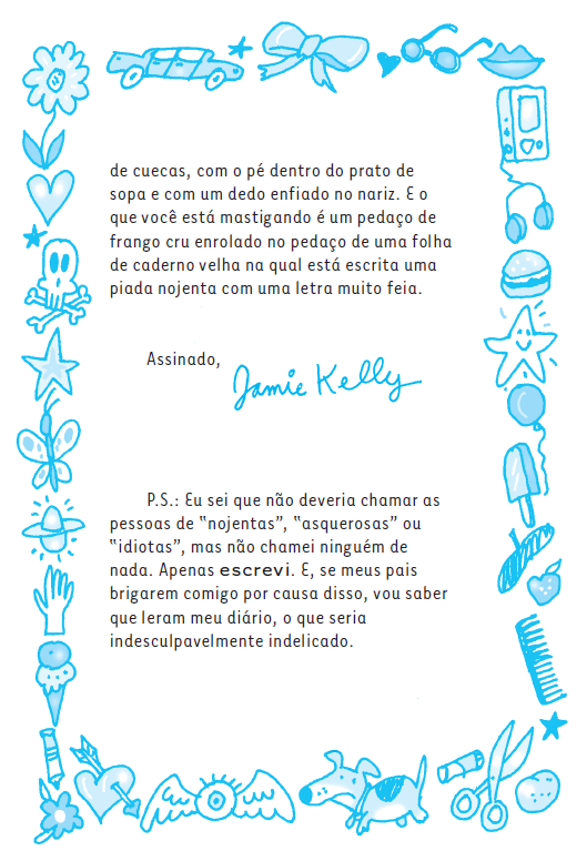 A protagonista, Jamie Kelly, é uma estudante do ensino fundamental com uma visão única — e hilária — sobre tudo ao seu redor: escola, amizades, família e dramas cotidianos. Escrito no formato de diário secreto, o livro faz com que as leitoras se sintam confidentes da personagem, criando uma conexão direta e divertida com cada situação vivida por ela.