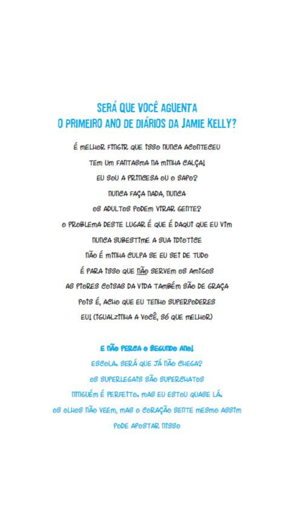 A protagonista, Jamie Kelly, é uma estudante do ensino fundamental com uma visão única — e hilária — sobre tudo ao seu redor: escola, amizades, família e dramas cotidianos. Escrito no formato de diário secreto, o livro faz com que as leitoras se sintam confidentes da personagem, criando uma conexão direta e divertida com cada situação vivida por ela.